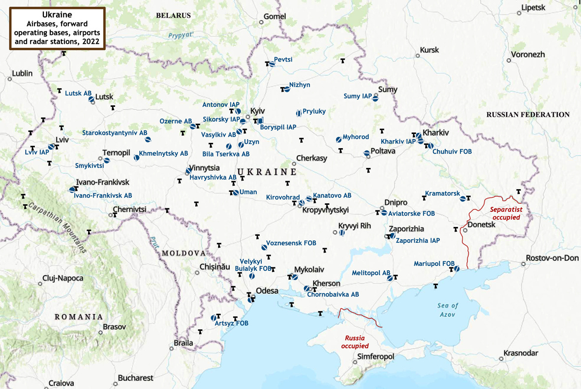 However, that’s a much oversimplified presentation. Alone because it’s neither showing major airbases (ABs), nor forward operating bases (FOBs), nor major garrisons of PSZSU’s ground-based air defence units. Even less so something like ‘present-times disposition’ of ground-based air defence units (which, of course, is really a ‘top secret’ topic). Point is: it’s not only time-consuming to collect the related data and add it to any such maps, but also the resulting maps tend to get overcrowded. Just for example, this would be a map of major ABs, FOBs and radar stations of the PSZSU as of early 2022: