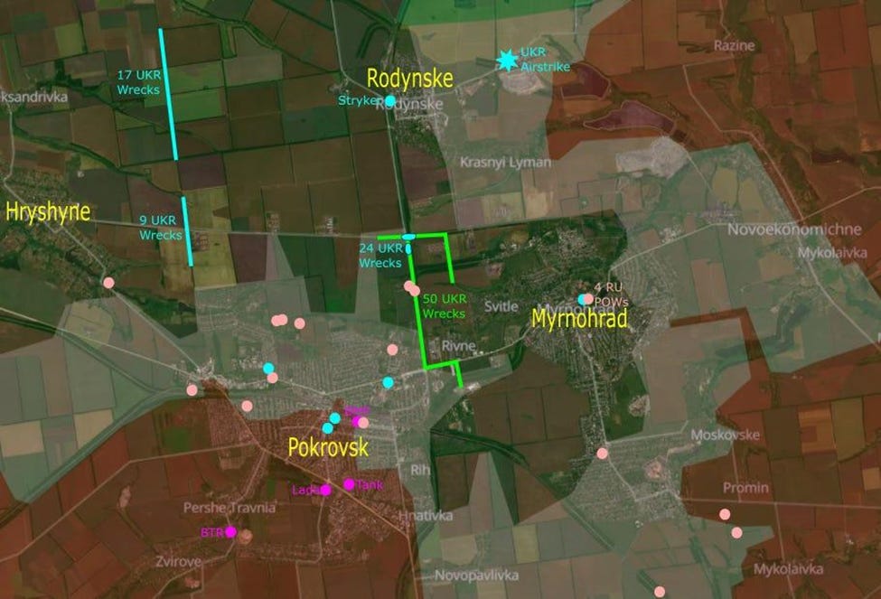 27 destroyed Ukrainian vehicles along a supply route into Pokrovsk. A Ukrainian Stryker is destroyed on the western edge of Rodynske. A Ukrainian airstrike east of Rodynske.