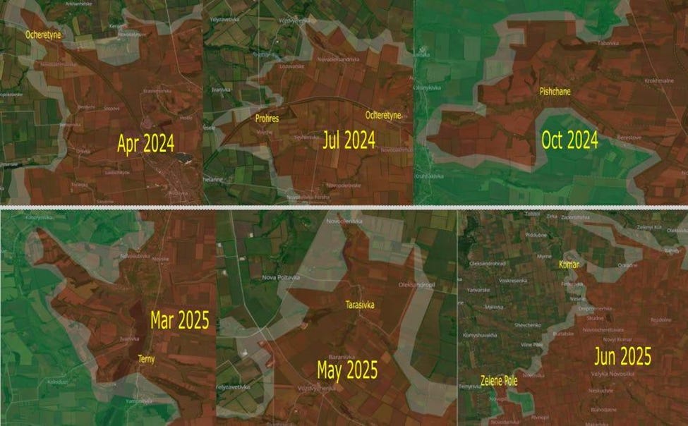 (From left to right) In April 2024, improper unit rotations left a gap at the railroad line near Ocheretyne. The Russians moved through it, Ukraine didn’t respond quickly and the defenses in front of Avdiivka unraveled. Three months later, the Russians infiltrated gaps and surrounded a battalion at Prohres. In the absence of leadership, the 47th Brigade took charge to rescue the battalion but the defenses were further disrupted. Terny had been held for months against heavy attacks but manpower shortages created bigger gaps and at some point the defenders couldn’t respond without operational or strategic help so the Russians kept walking forward. The crisis for Pokrovsk and Kostiantynivka began when about 20 Russians on motorcycles chased away the defenders at Tarasivka and there was no effective Ukrainian response for weeks. The Komar sector has been plagued by long, narrow penetrations that lead to retreats and even more long narrow penetrations.