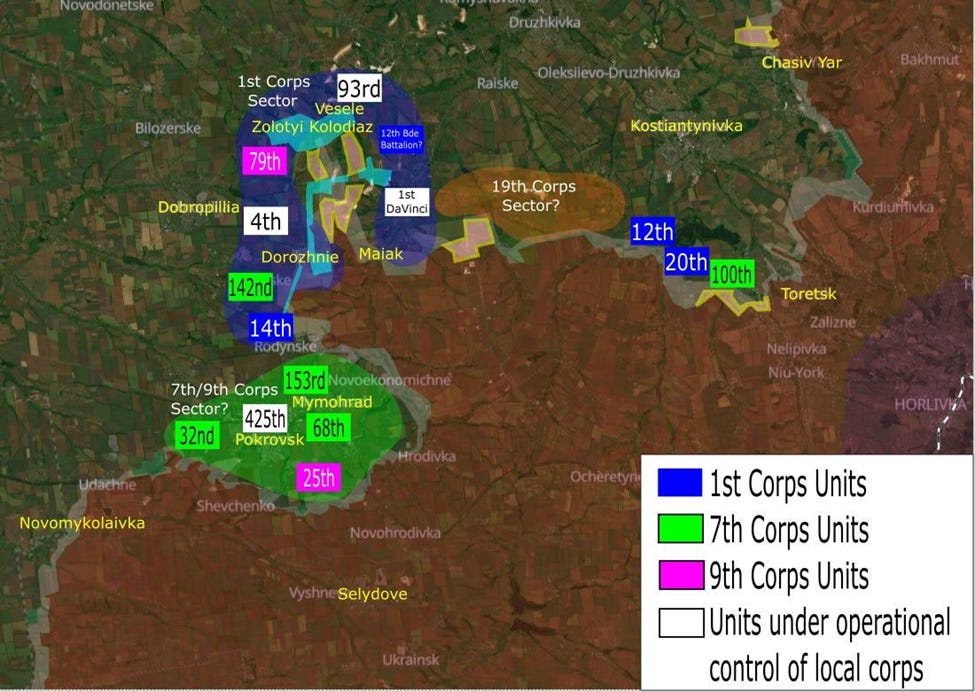 See this: the 1st Corps taking over has never been publicly announced. Moreover, it’s brigades were - and remain - scattered all over the place. Indeed, until this very day the 12th Azov Brigade (the lead unit in the corps) and 20th Lyubart Brigade are still defending Konstianynivka. The 15th Kara Dag and 1st Bureviy brigades are still reported as fighting around Kupiansk. Arguably: the 14th Chervona Kalyna brigade is ‘north of Pokrovsk’…