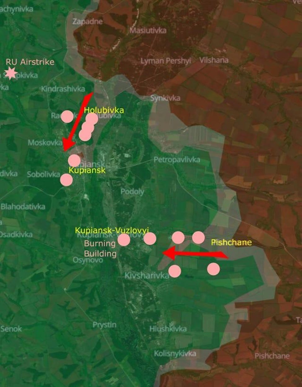 In Kupiansk-Vuzlovyi, four Russians were killed. Two more ran into a building. They were offered surrender, which one accepted. The other met his fate in the second-story window of a burning building.