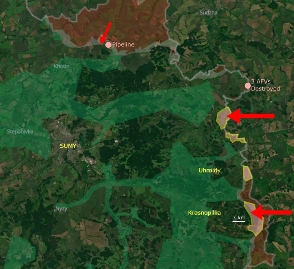 There was a moderate intensity effort along a 40 km wide sector that gained as much as 3 km of ground for Russia. Most of the operation was conducted by infantry but three Russian AFVs were destroyed trying to cross the border.