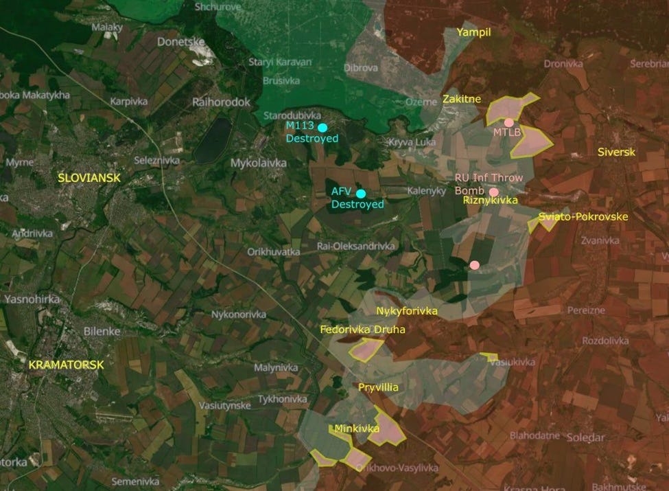 The 93rd Brigade worked with Lasar’s Group and the Phoenix border guard unit to kill 40 Russians in 24 hours. The sector remains unstable and Russian forces are slowly advancing within 15 km of Kramatorsk.