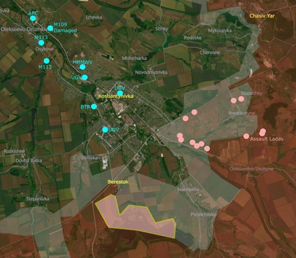 The 3rd Brigade expends two kamikaze ground drones on one building north of Novoselivka. Ukraine was aware of Russian plans to attack and prepared the battlefield with remotely placed mines. When the attack came, drones destroyed 2 tanks, 5 APCs, 7 BMPs and over 40 ATVs. The Kraken attacked Russian targets in and around Novoselivka.