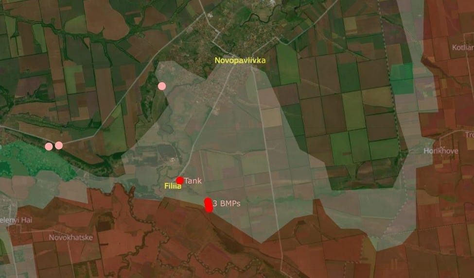 Russian infantry appear to be eliminated when they move towards Novopavlivka, but they are being engaged over wider and deeper territory as the weeks go by.