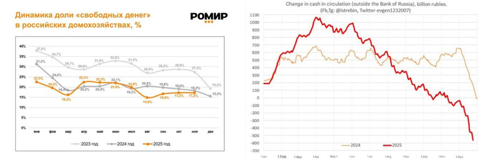 (Left) There is less “free money” in the economy. After buying essentials, the average Russian household has almost half the money available that it did two years ago.