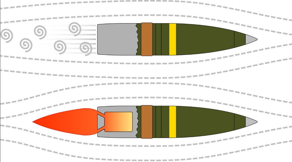 The flat base of an artillery shell creates aerodynamic drag on an artillery shell. Base bleed shells expel gas while the shell is in flight, reducing its drag and extending the range of the shell by 20-35%.