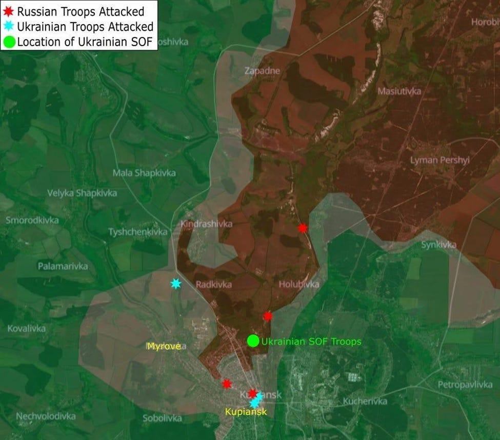У районі Куп'янська не так багато інформації, але українські безпілотники все ще атакують північну частину міста. На північ від міста українські бійці з 8-го підрозділу ССО вели бойові дії. Зі своїх позицій вони змогли перехопити російські війська, які намагалися увійти до міста.