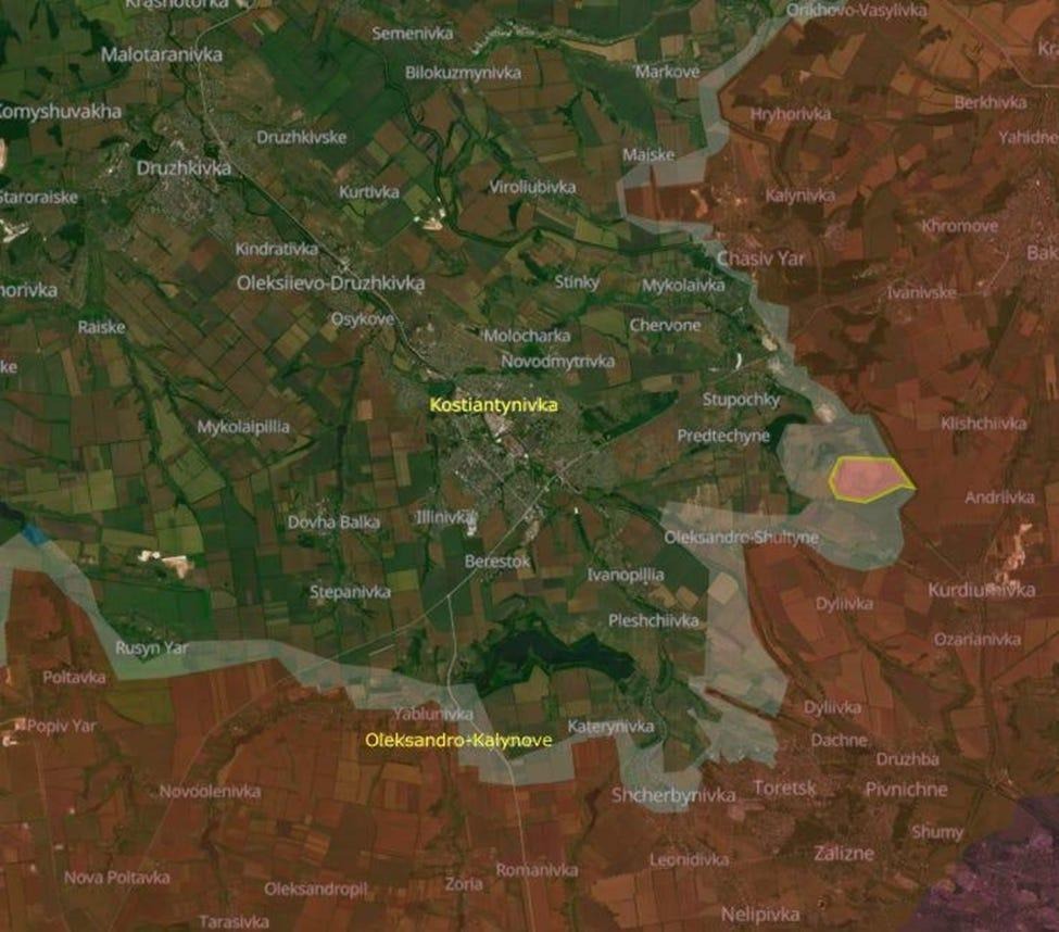 Російські обстріли тривають з південного сходу від Костянтинівки, створюючи більшу сіру зону. Сподіваючись, що сильний вітер і дощі придушать роботу безпілотників, Росія спробувала здійснити механізовану атаку і втратила 18 бронемашин через атаку прикордонного підрозділу безпілотників "Фенікс".