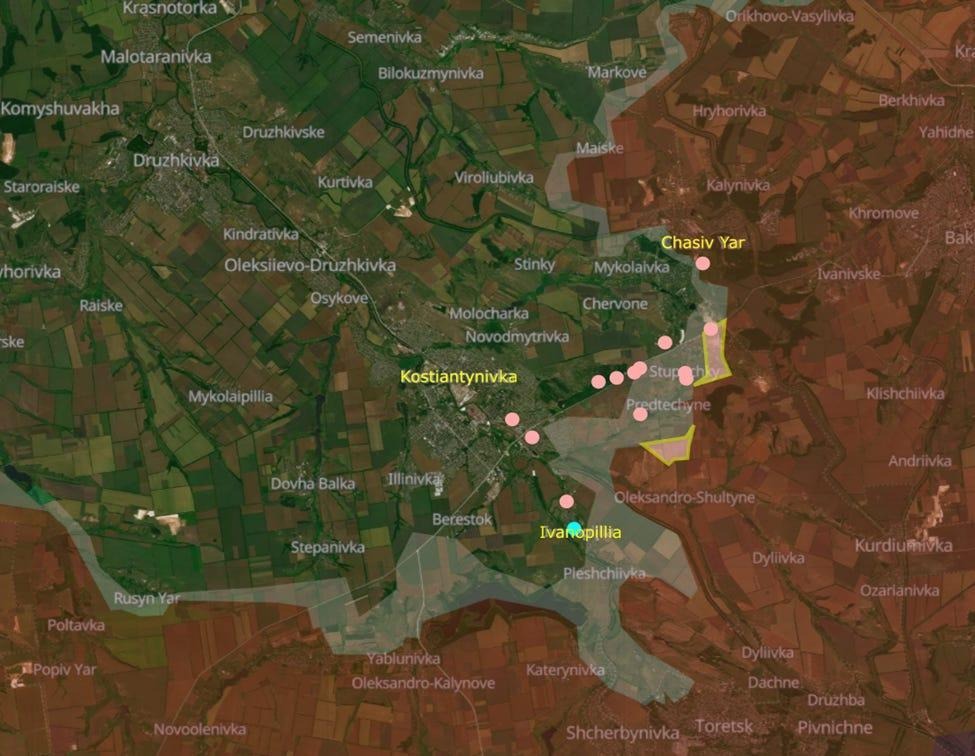 Поки росіяни продовжують блукати і проникати по флангах міста, в Іванопіллі вночі на українця напав дрон. Росіянин зазнав нападу на шляху до Костянтинівки з північного сходу.